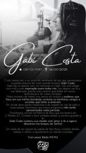 A Rádio 92 FM comunicou nesta quarta-feira (23) a morte da locutora Gabi Costa, de 37 anos. Na rádio, que tem forte audiência entre o público evangélico, a comunicadora apresentava o programa “Energia Máxima”, ao lado do diretor da emissora, Ramon Ernandes.