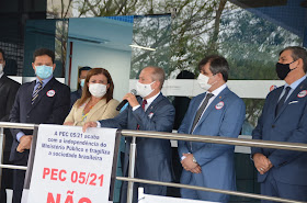Nesta quarta-feira, 13, em frente à sede das Promotorias de Justiça da Capital, no Calhau, membros e servidores do Ministério Público do Maranhão participaram de um ato público de repúdio à Proposta de Emenda Constitucional (PEC) 005/2021, que pode causar prejuízos à atuação do MP brasileiro e ao sistema de Justiça como um todo. A mobilização recebeu o apoio de integrantes do Judiciário, Defensoria Pública, Ministério Público Federal e representantes da sociedade civil organizada.